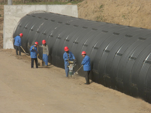 波紋管涵在壓縮狀態(tài)下工作時(shí)的允許壓縮位移量比工作在拉伸狀態(tài)下的允許拉伸位移量要大一些,所以在設(shè)計(jì)波紋管涵時(shí)應(yīng)盡可能讓波紋管涵在壓縮狀態(tài)下工作。通過實(shí)驗(yàn)發(fā)現(xiàn),在一般情況下,同一材料、同一規(guī)格的波紋管涵,其允許的壓縮位移是允許的拉伸位移的1.5倍。
