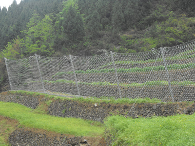 這種網(wǎng)子是雙層網(wǎng) 內層是由一層一般孔徑為5*5cm的勾花網(wǎng)組成 外層是鋼絲繩網(wǎng)絲徑8mm 孔徑30*30cm的 ,一般攔石頭的話(huà)高度要設置在4-6米,每三米最好加一根鋼柱高度要比網(wǎng)子高30公分左右。